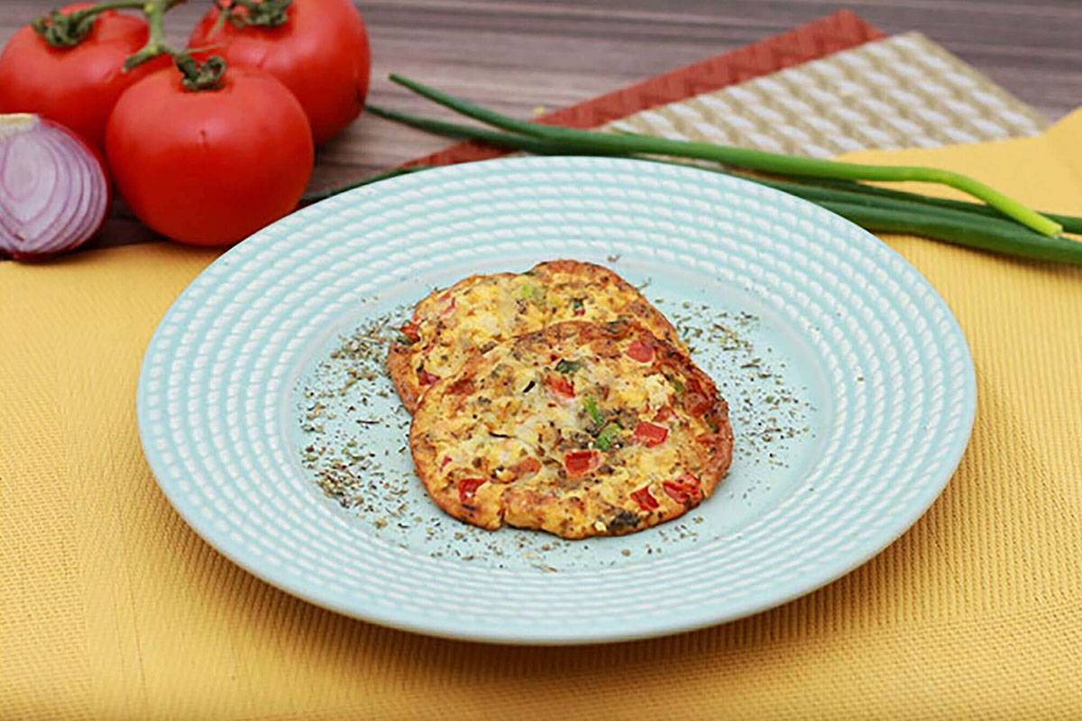 Omelete com queijo, tomate e orégano.